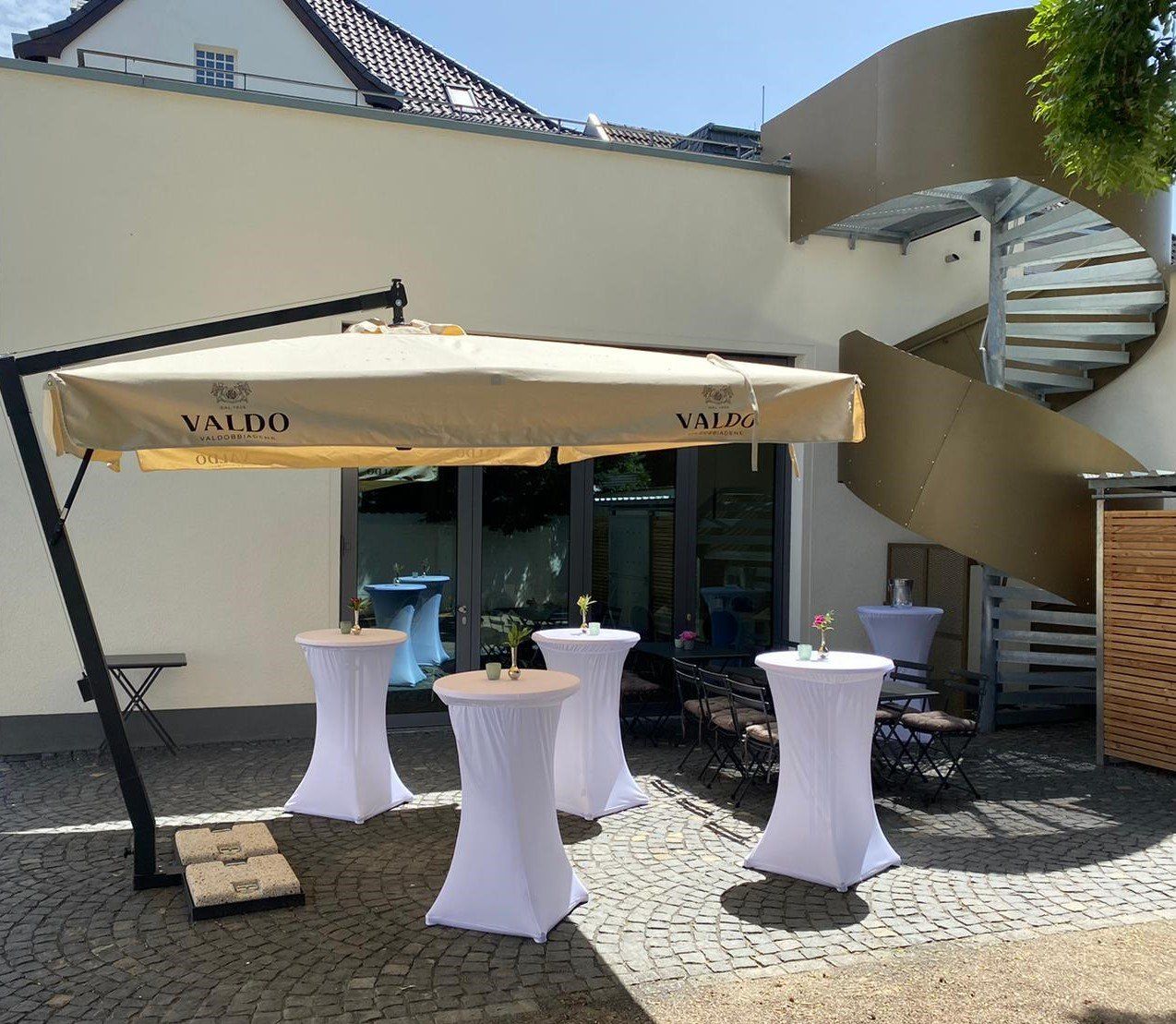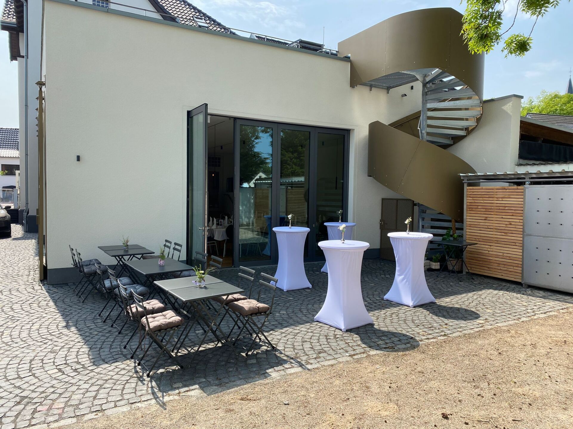 · Steh- und Sitzmobiliar im Saal & auf der Terrasse